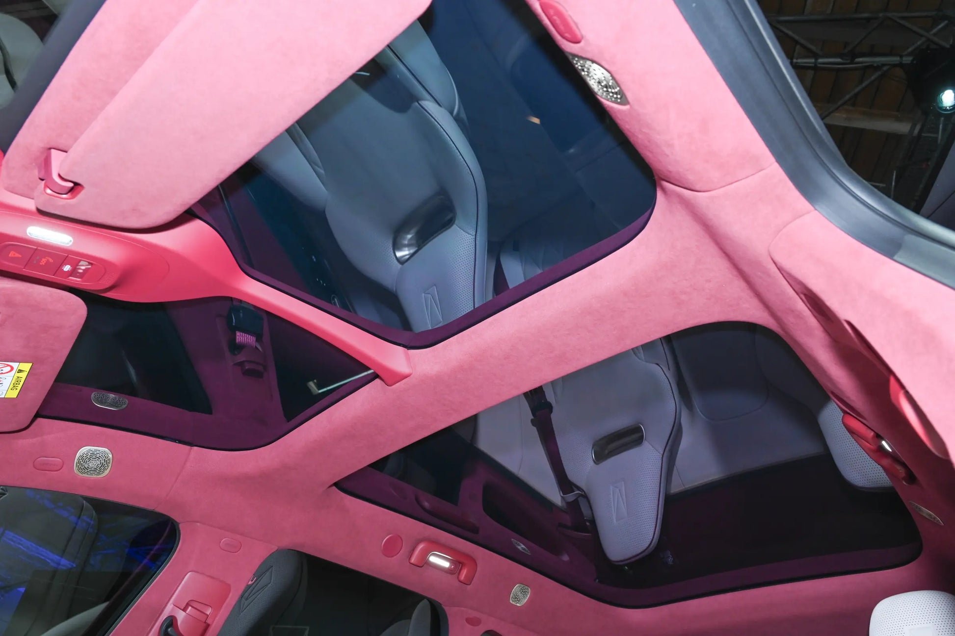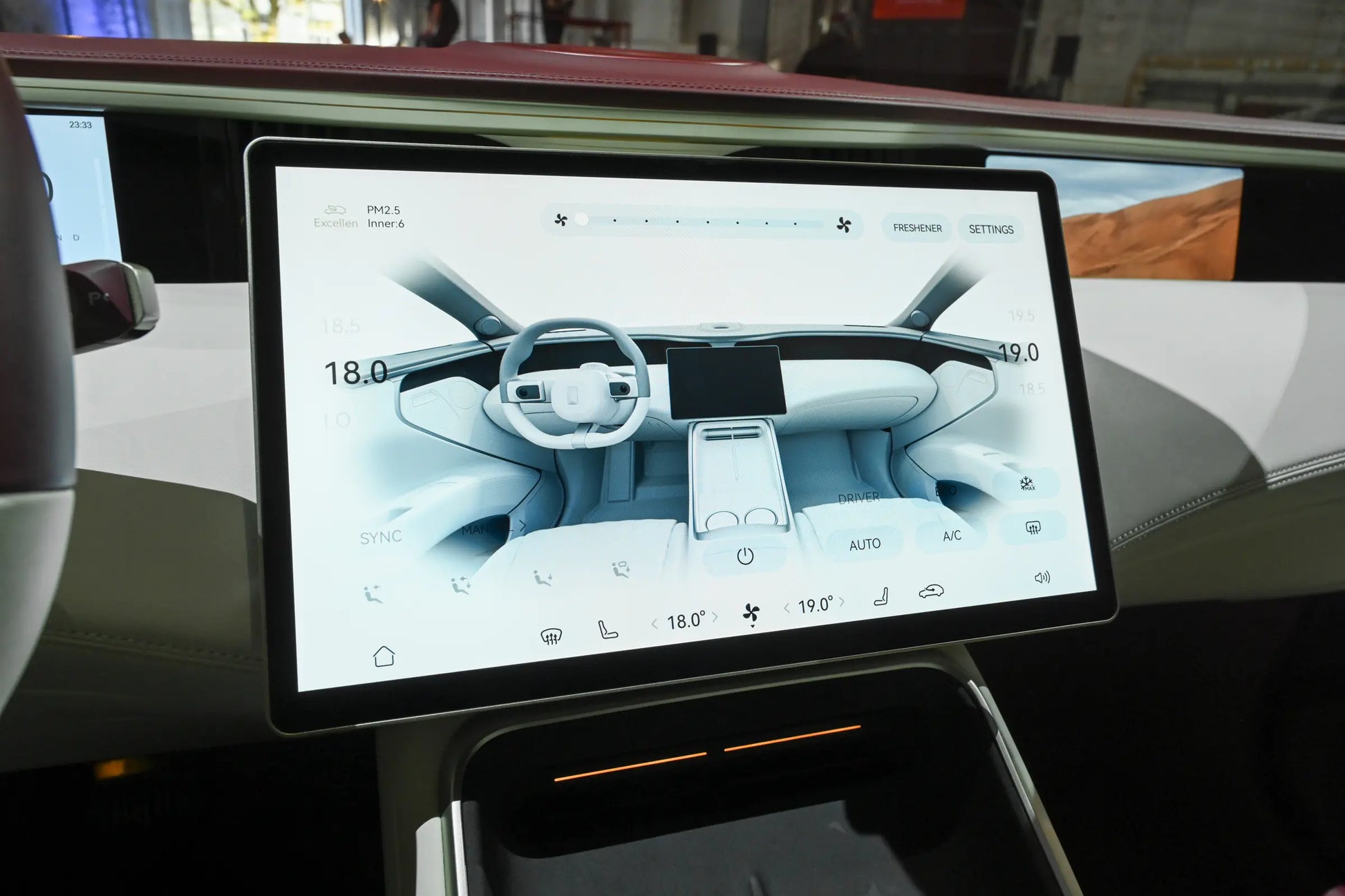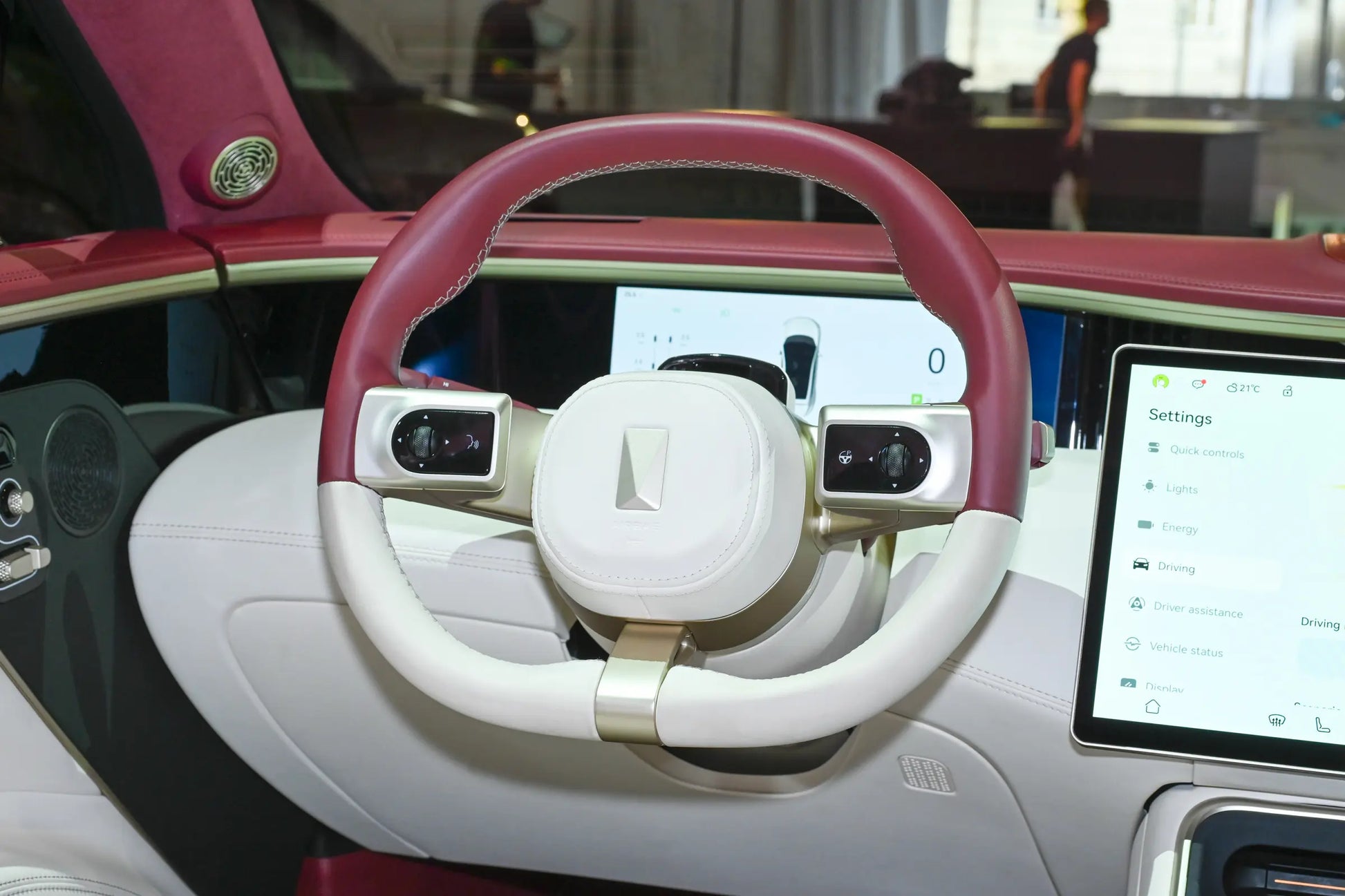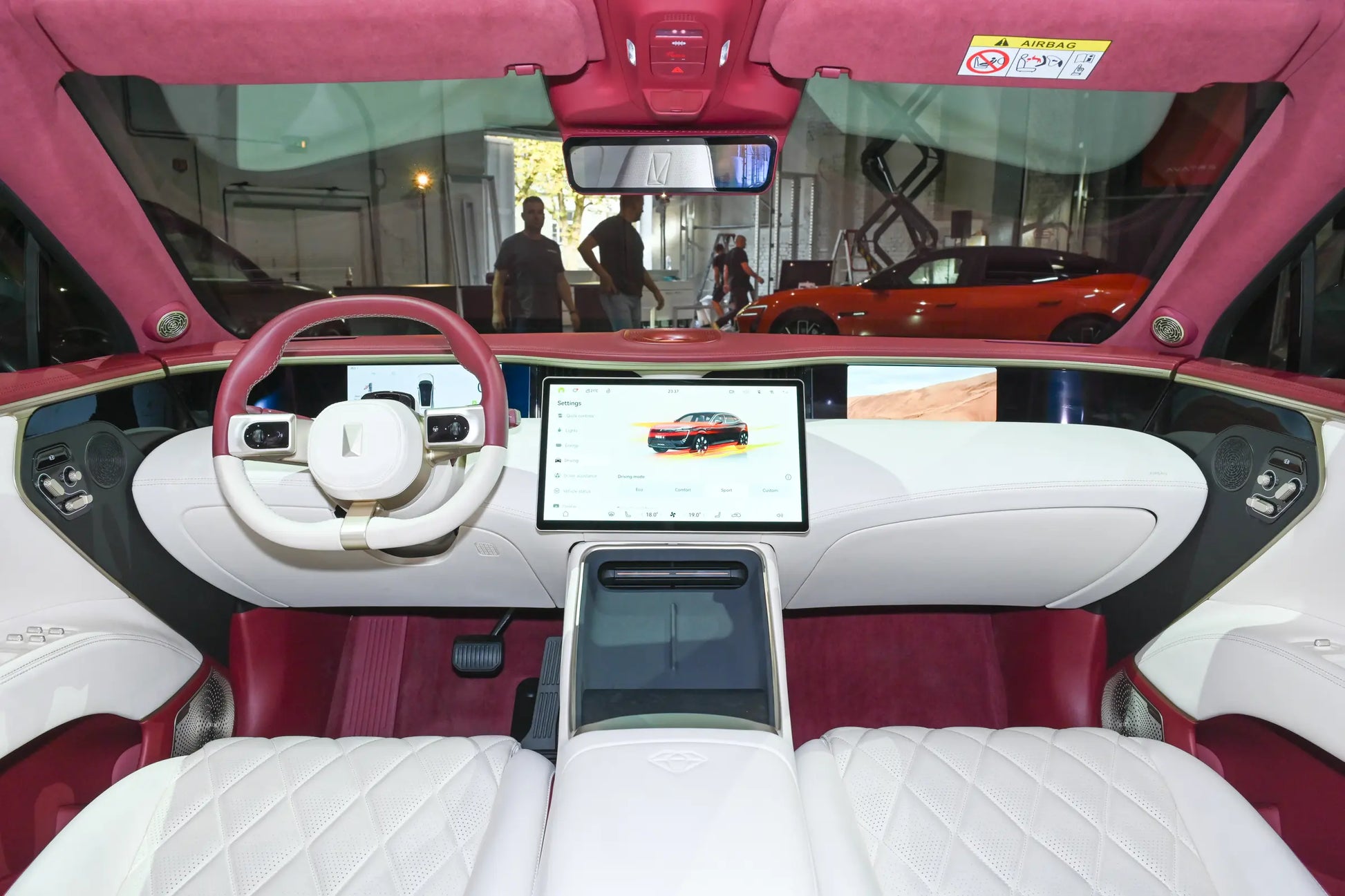 ينطبق الأمر نفسه على التصميم الداخلي. فرغم وجود ثلاث شاشات أيضًا، ابتكر المصمم بعض الحيل. فالشاشات الصغيرة على كلا الجانبين مدمجة، وهناك فاصل واضح بين عجلة القيادة وشاشة التحكم المركزية الكبيرة.